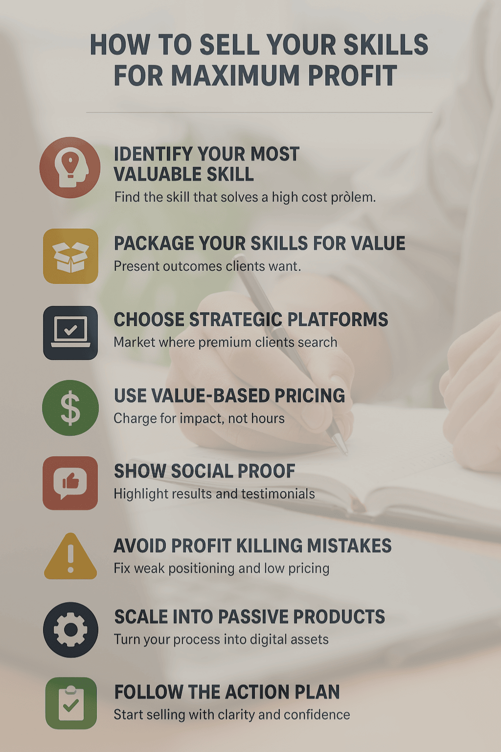 Selling your skills for maximum profit requires a change in mindset, as the market consistently rewards clarity, confidence, and measurable results. If you commit to solving genuine problems and showcasing clear, undeniable outcomes, clients will pay top dollar for the expertise only you can deliver.